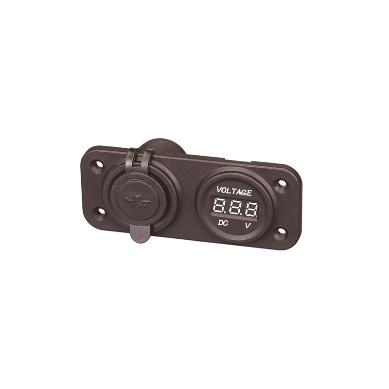 Pannello in plastica in PVC con doppia uscita USB ed indicatore voltmetro per lo stato delle batterie. Cappuccio di protezione per le prese USB.