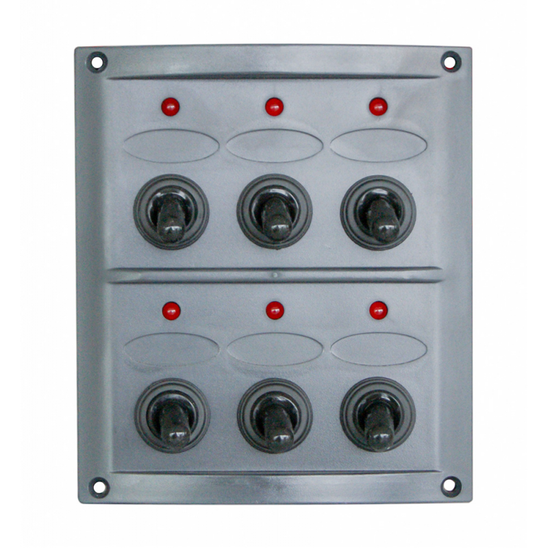 Pannello elettrico in ABS resistente ai raggi UV, interruttori a leva protetti da cappucci in gomma, con fusibili lamellari da 15 Amp in linea dietro il pannello e simboli adesivi.