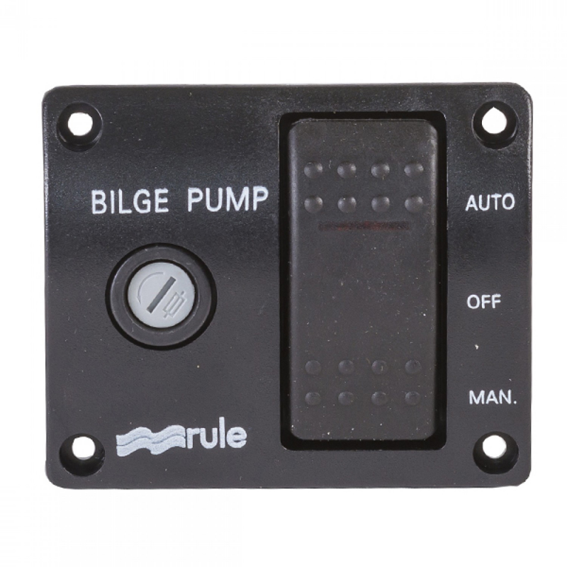 Pannello in plastica nera per pompe di sentina. Interruttore basculante con spia luminosa a 3 posizioni AUTOMATICO-OFF-MANUALE con ritorno automatico nella posizione manuale. Completo di portafusibile.