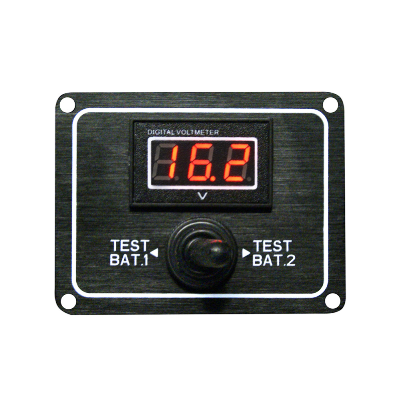 Pannello in lega leggera verniciato nero con indicatore digitale. Permette di verificare lo stato di due batterie separate o di due gruppi batterie separati. Alimentazione 12V, fissaggio tramite 4 viti.