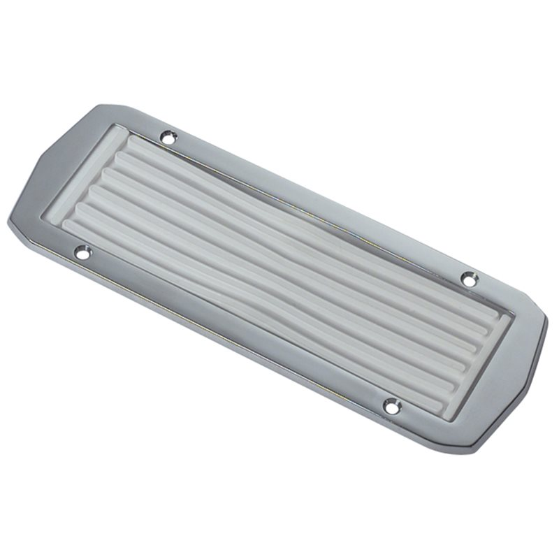 Pedana poggia piedi con cornice in ottone cromato e gomma antiscivolo bianca.