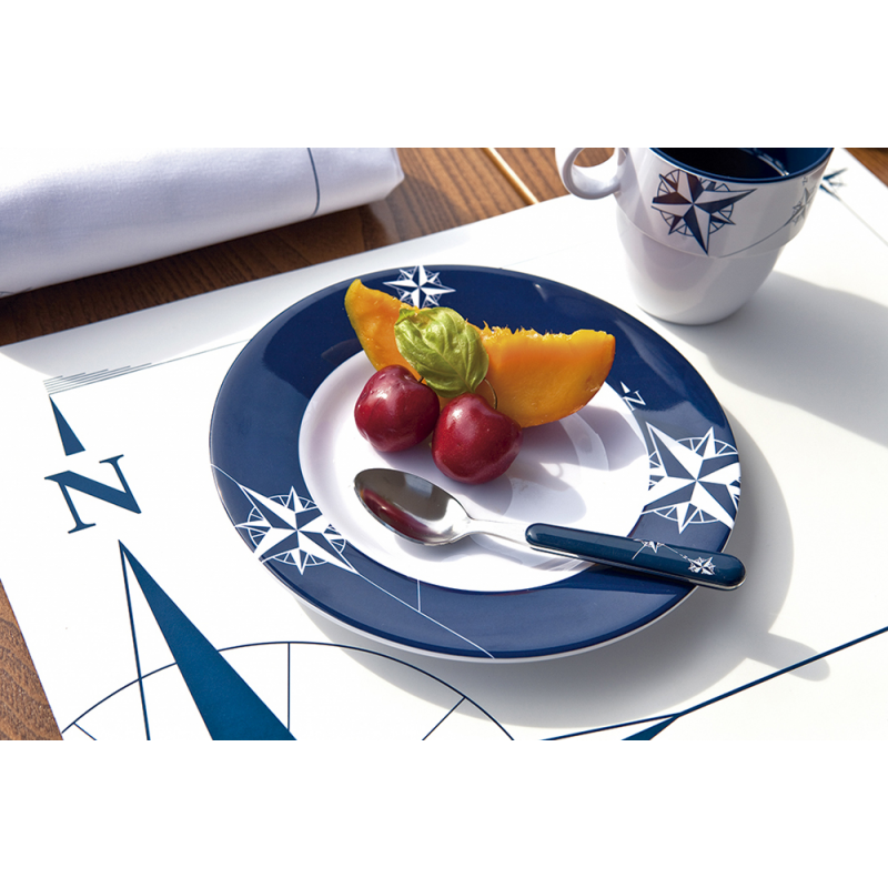 Servizio da tavola realizzato in melamina al 100%. Sui toni del blu navy e bianco. Lavabili in lavastoviglie. Le stoviglie, le tazze e i bicchieri hanno un anello antiscivolo alla base che ne impedisce lo scivolamento sul tavolo.