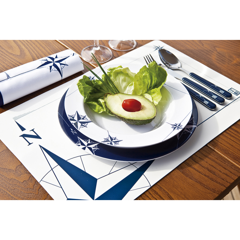 Servizio da tavola realizzato in melamina al 100%. Sui toni del blu navy e bianco. Lavabili in lavastoviglie. Le stoviglie, le tazze e i bicchieri hanno un anello antiscivolo alla base che ne impedisce lo scivolamento sul tavolo.