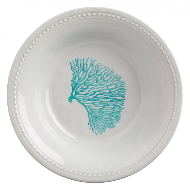 Servizio da tavola realizzato in melamina al 100%, PBA Free. Decorato con disegni di coralli. Lavabili in lavastoviglie.