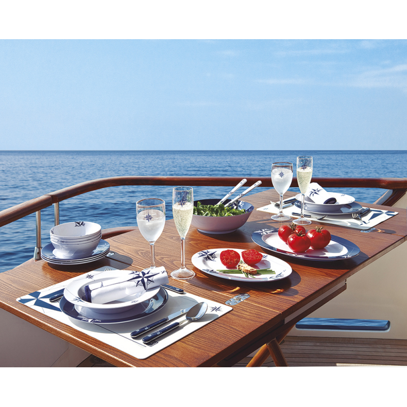 Servizio da tavola realizzato in melamina al 100%. Sui toni del blu navy e bianco. Lavabili in lavastoviglie. Le stoviglie, le tazze e i bicchieri hanno un anello antiscivolo alla base che ne impedisce lo scivolamento sul tavolo.