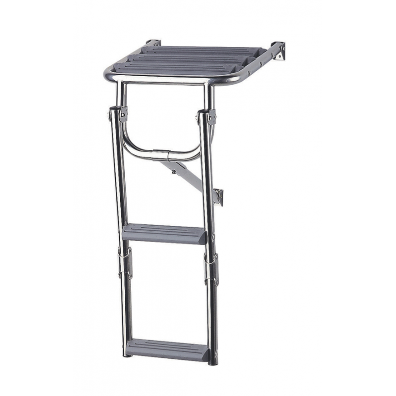 Plancetta di poppa in PVC con scaletta pieghevole ribaltabile in acciaio inox e PVC grigio antiscivolo. I gradini, larghi per una maggiore stabilità e comfort, rendono l’accesso al mare sicuro e comodo.