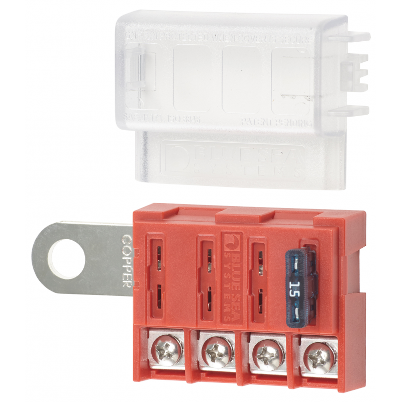 Permette di aggiungere facilmente fino a 4 circuiti sotto fusibile ATO/ATC direttamente al terminale della batteria. Montaggio direttamente sul perno della batteria o morsetto batteria. Rif. originale 5023