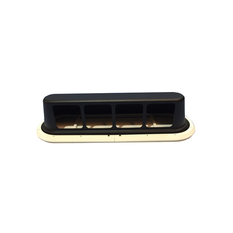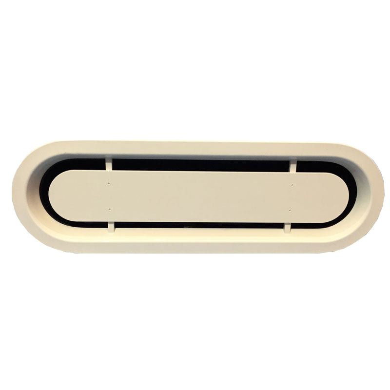 Presa aria Gebo in lega leggera verniciata bianca (RAL9010) ad incasso completa di convogliatore posteriore che impedisce l’ingresso dell’acqua dall’esterno.
