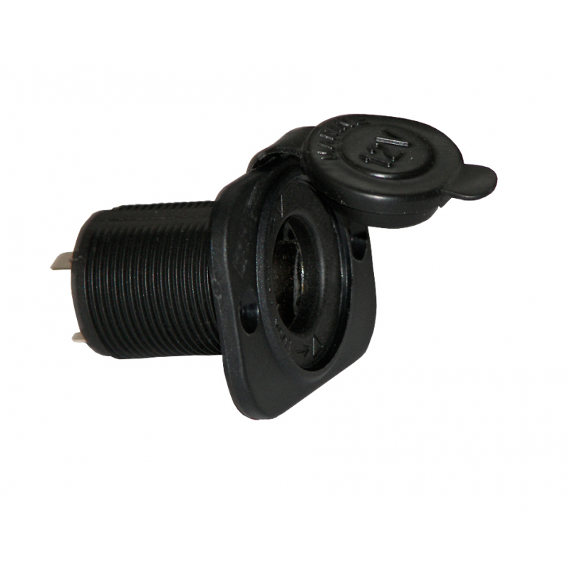 Presa di corrente ad incasso in policarbonato nero tipo accendisigari. Montaggio con dado nella parte posteriore filettata o con pannellino a 2 viti frontali. Per 3939361/366.