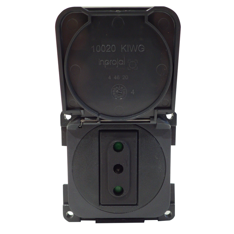 Presa Italiana 230 V con coperchio e protezione posteriore. Foro di incasso ø mm. 45, profondità mm. 48. Equipaggiamento elettrico modulare in plastica grigia ral 7015.