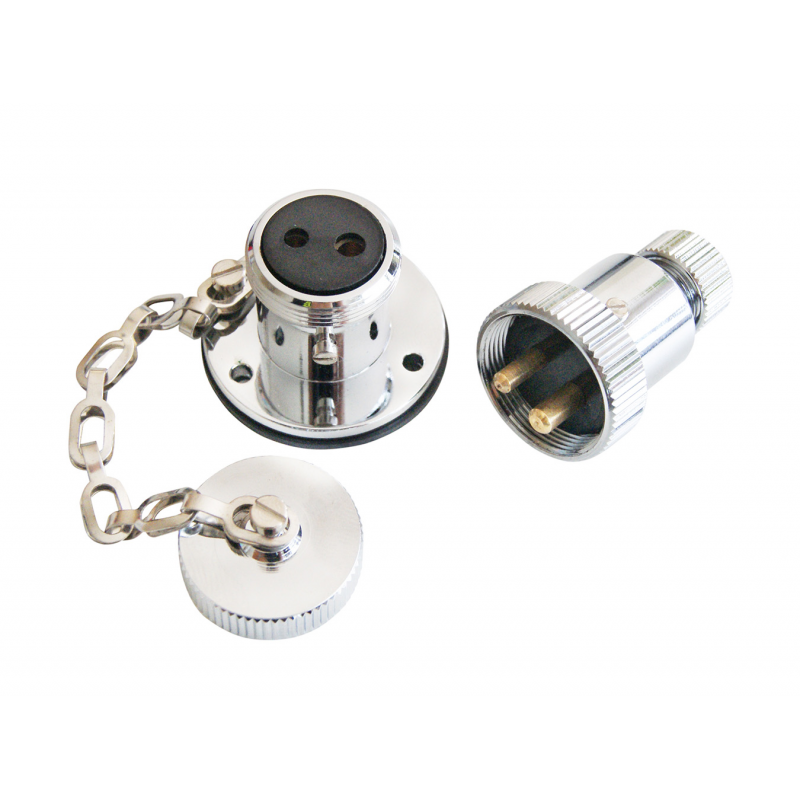Connessione presa spina stagna in ottone cromato con coperchio a vite.