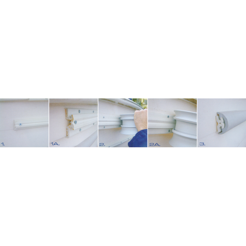 Profilo parabordo brevettato in PVC per accoppiamenti scatolati. La peculiarità di questo profilo è quella di poter essere applicato a freddo in pochi, veloci passaggi. 1/1A - Applicazione del binario, avvitamento/rivettatura 2/2A - Applicazione del profilo rivoltandolo all’indietro il più possibile con una curva ben accentuata, (Radial 80 deve essere scaldato a 40° C), i due inserti di tenuta si apriranno, spingere energicamente verso il binario rigido, avanzando velocemente 3 - Prodotto applicato