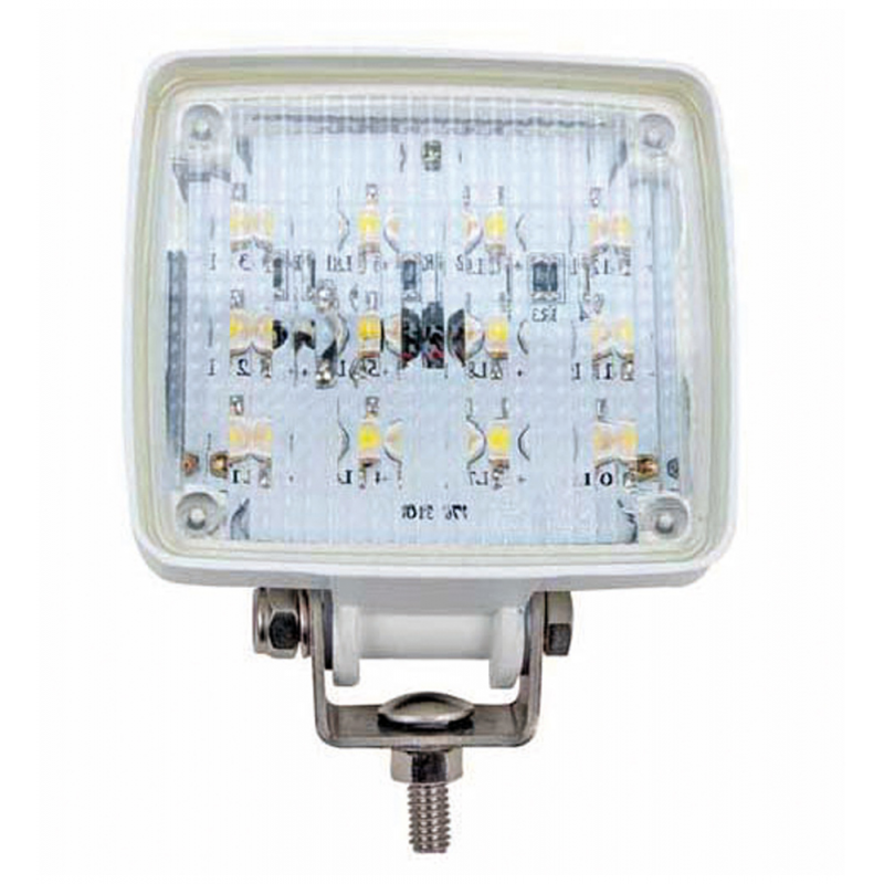Proiettore stagno IP67 in lega leggera, colore bianco a 12 LED. Staffa in acciaio inox snodata e orientabile. Alim. 12-24V 13W. Potenza luminosa 950 lumens.