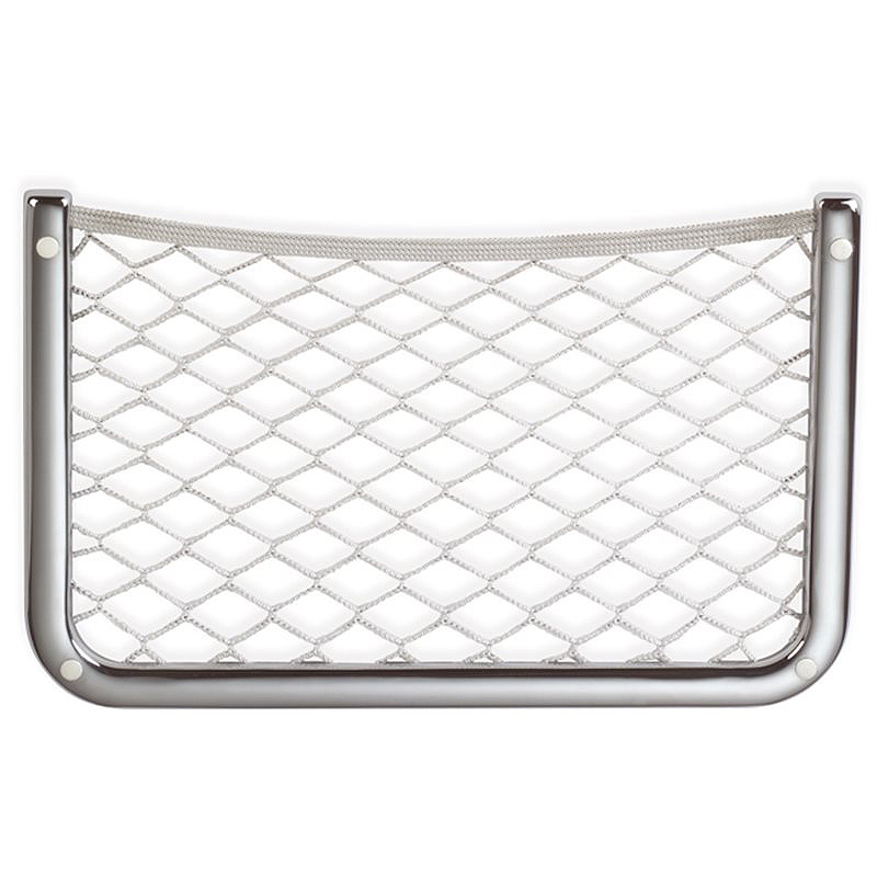 Rete portaoggetti con filetto superiore in treccia elastica. Fissaggio con viti.