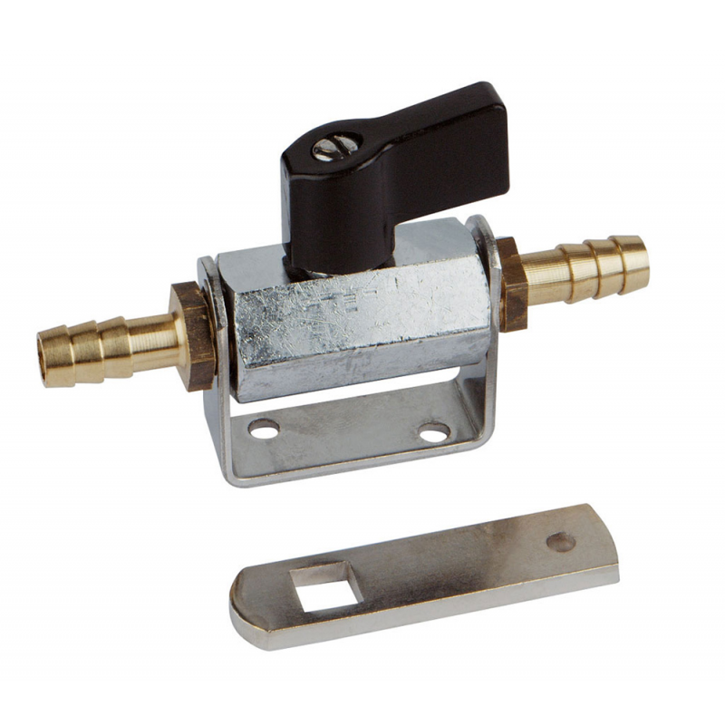 Valvola in ottone cromato per carburante. Movimento a sfera, regolamentare R.I.Na., dotato di braccetto per comando a distanza. Passaggio interno ø mm. 8, filettatura f/f da 1/4” gas. Completo di supporto a parete e due porta gomma da 1/4” x 10. Con il supporto si può montare lungo la tubazione, senza il supporto direttamente sul serbatoio.