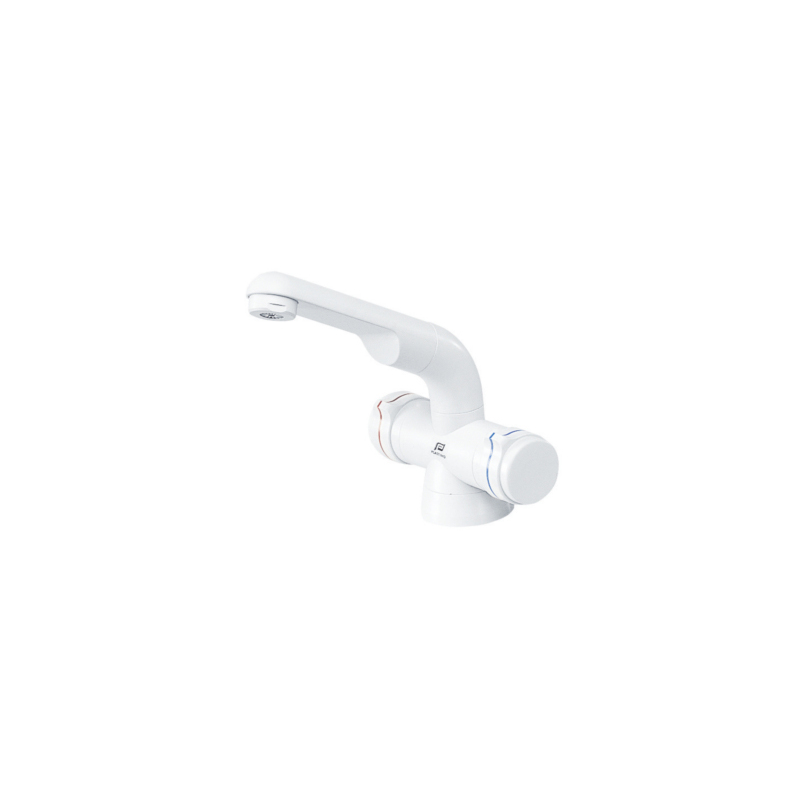 Rubinetto di colore bianco. Con due rubinetti caldo/freddo. Con ugello a spruzzo per un flusso d’acqua uniforme. Beccuccio girevole.