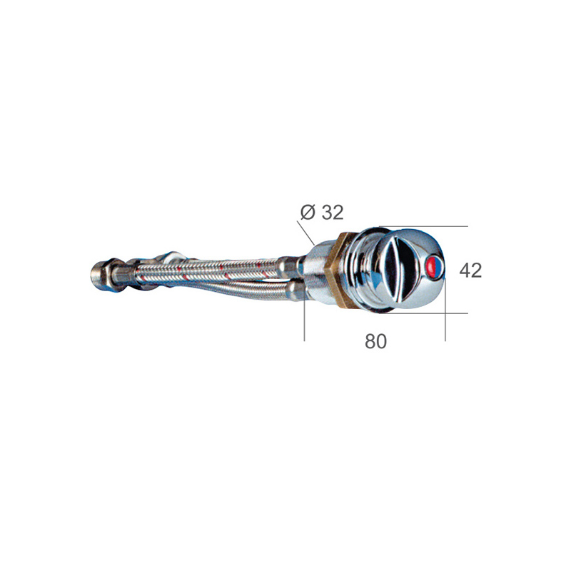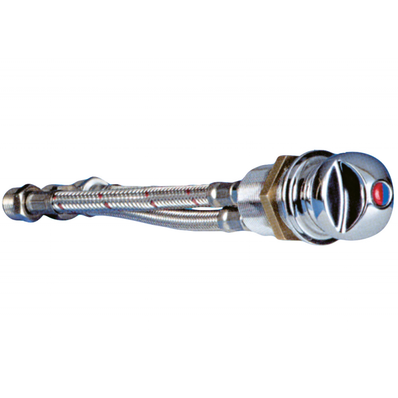 Rubinetto miscelatore in ottone cromato, acqua calda/fredda, per doccia separata. Sporge per 40 mm e si apre inclinando la manopola. Completo di 2 flessibili da 3/8”