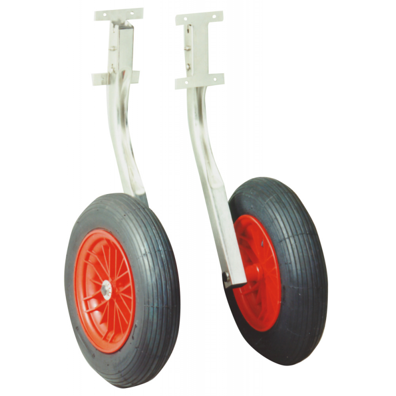 Ruote di poppa ribaltabili per alaggio canotti pneumatici. Gambi e attacchi universali fabbricati in acciaio inox. Ruote in gomma gonfiabili, foro ø cm 2. Portata kg 240. Ruote di ricambio articolo 3030885