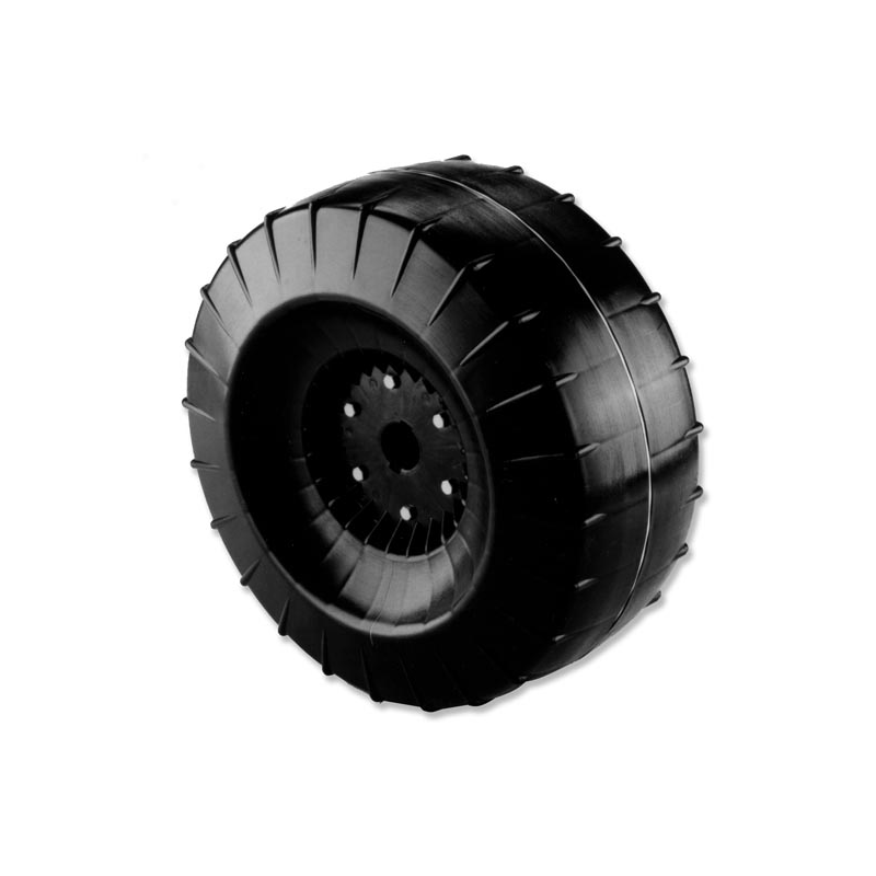 Ruota in plastica di grande sezione per evitare gli sprofondamenti nella sabbia, provvista di righe orizzontali per facilitarne lo scorrimento.