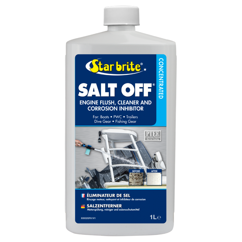 Protettivo anti sale concentrato. Rimuove i depositi di sale da ogni superficie marina. Da usare per risciacquare i motori fuoribordo e entrobordo. Protegge dai danni da UV.