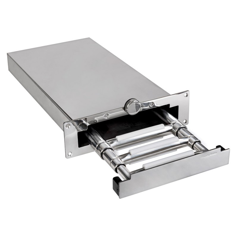 Scaletta telescopica a scomparsa Mini e box in acciaio inox AISI 316 lucidati a specchio dalle ridotte dimensioni, ideale per essere incassata nello spessore delle plancette di piccole imbarcazioni. Funzionamento a scatto. Ideale per gommoni e piccole unità.