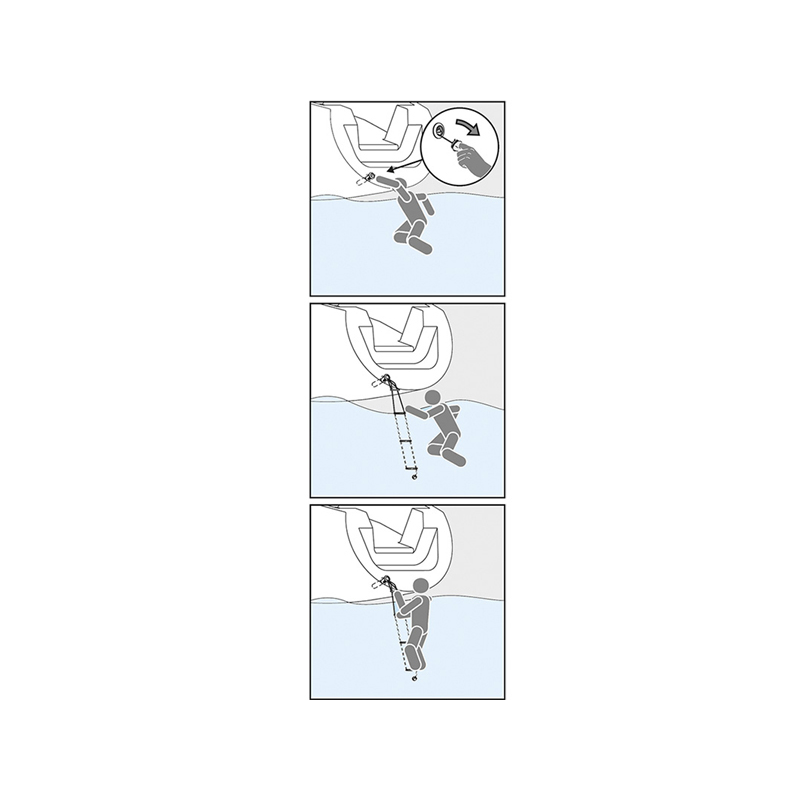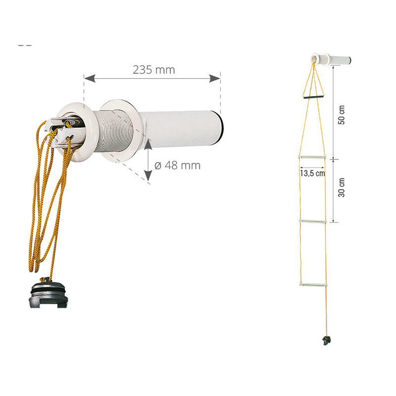 Scaletta di sicurezza ad incasso composta da 3 gradini in polipropilene e da una maniglia in acciaio inox uniti da una cima. La scaletta è collocata in un tubo in poliammide chiuso da un tappo grigio per una perfetta tenuta stagna. Si installa ad incasso, a poppa o di fianco appena sopra la linea di galleggiamento.