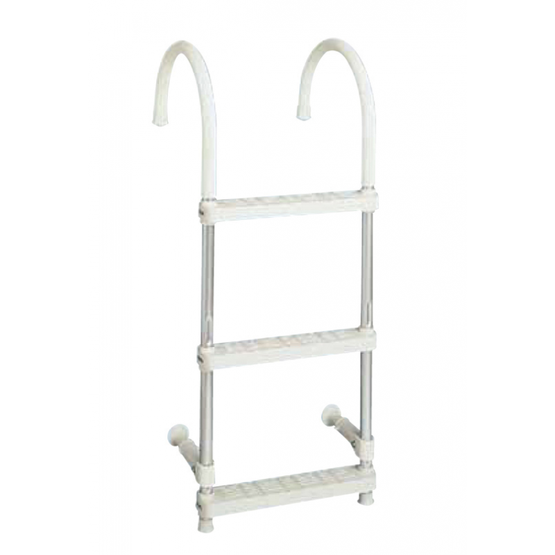 Scaletta in tubo di alluminio anodizzato con gradini in plastica. Dotata di attacchi curvi e pieghevoli all’interno, ricoperti da una guaina in plastica, e distanziatori regolabili.