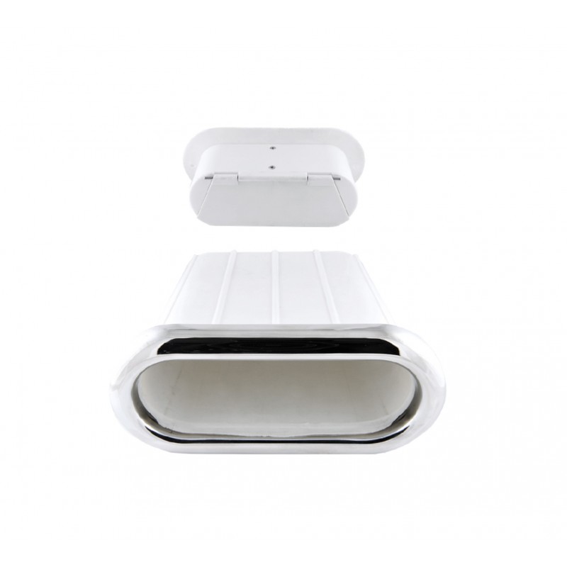 Scarico per pozzetti in nylon con ghiera esterna a vista in acciaio inox AISI 316. La piastra di montaggio inclinata di 15° e lo sportellino permettono l’uscita dell’acqua ma non l’entrata.