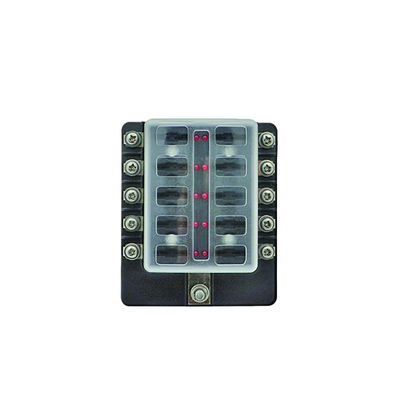 Scatola portafusibile in policarbonato per fusibili lamellari standard, coperchio trasparente con etichette utenze.