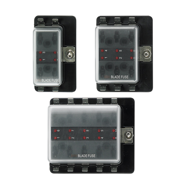 Scatola portafusibile in policarbonato per fusibili lamellari standard, con coperchio trasparente e LED rosso di allarme fusibile bruciato. Capacità max di 30A per ciascuna linea fino ad un max di 100 complessivi. Terminali faston.