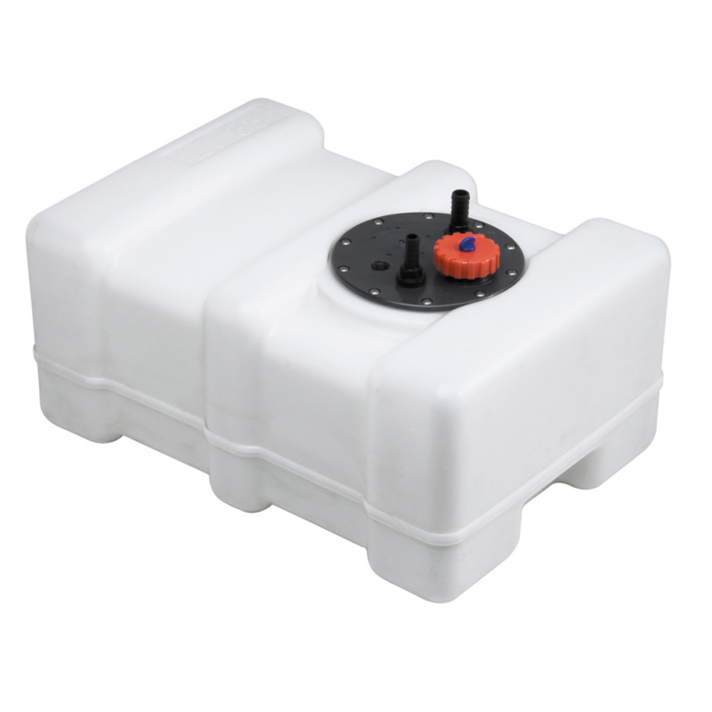 Serbatoio acqua in plastica. Completo di boccaporto ispezionabile laterale, tappo con sfiato, portagomma ø mm 16/19 e filetto 3/8, portagomma ø mm 10/12 e filetto 3/8.