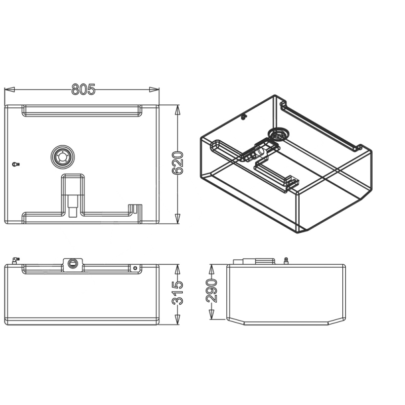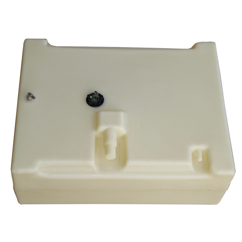 Serbatoio rigido per carburante costruito in polietilene reticolato di colore neutro, certificato CE in accordo con la direttiva 94/25/CE secondo normativa ISO 10088 - ISO 21487. Forma carenata, a sezione trapezioidale rovesciata che segue il profilo e l’inclinazione dello scafo al fine di sfruttare al massimo lo spazio di sentina. Provvisto di sensore di livello universale, può funzionare o a 10-180 ohm o a 240-33 ohm. Inserti per imbarco, sfiato ø mm. 16, pescante e ritorno ø mm. 12. Ogni serbatoio è collaudato singolarmente.