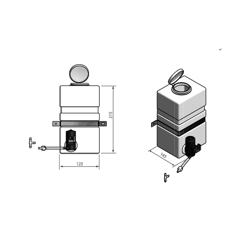 Serbatoio in polietilene per lavavetri con pompa elettrica a 12V incorporata. Staffa di fissaggio in acciaio INOX.