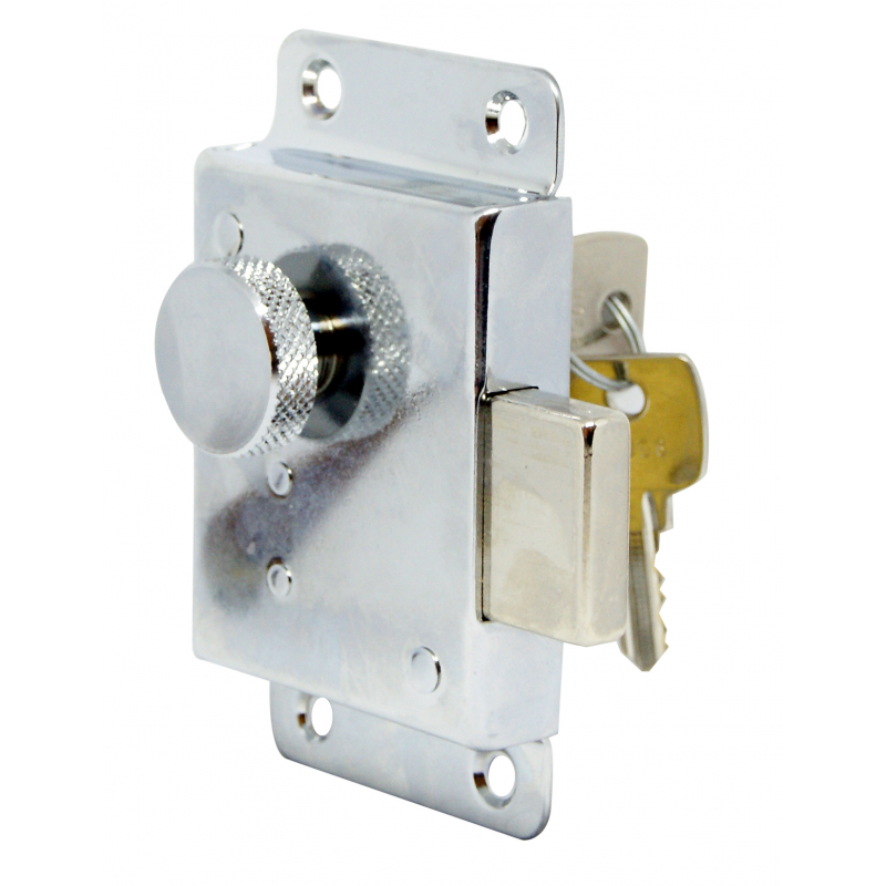 Serratura in ottone cromato da appoggio per porte a due mandate, con pomolo zigrinato all’interno e cilindro all’esterno. Mano universale DX e SX.