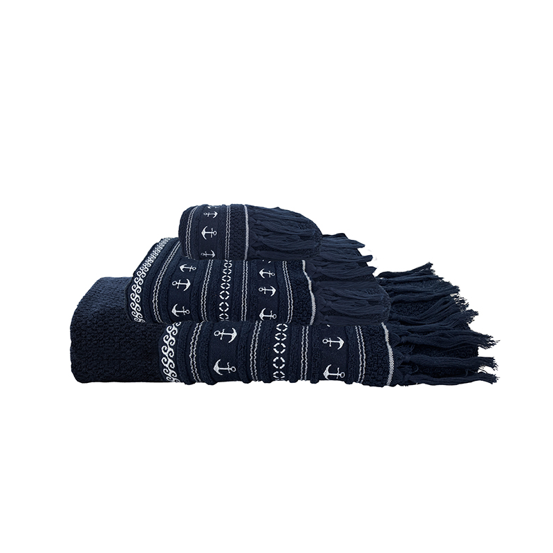 Set di asciugamani fabbricati in spugna 100% cotone di alta qualità da 550gr. Vellutati al tatto, con tessiture e ricami, gli asciugamani da viso, doccia e bidet di questa elegante collezione sono ideali per dare un leggero tocco nautico al bagno di qualsiasi imbarcazione.