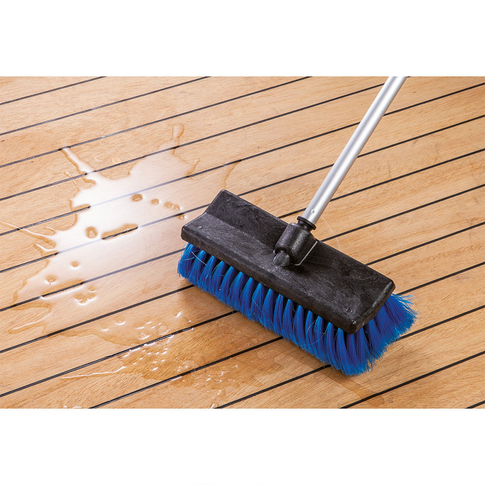 Set pulizia composto da asta in alluminio telescopica e spazzolone con setola morbida. Predisposto per innesto tubo acqua sul manico.