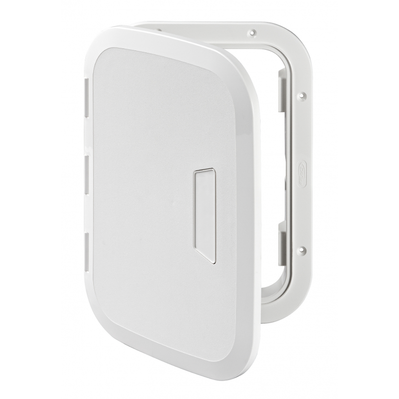 Sportello in ASA, colore bianco, resistente ai raggi UV, apribile a 180° con maniglia push-pull e chiusura a scatto. Montaggio verticale.
