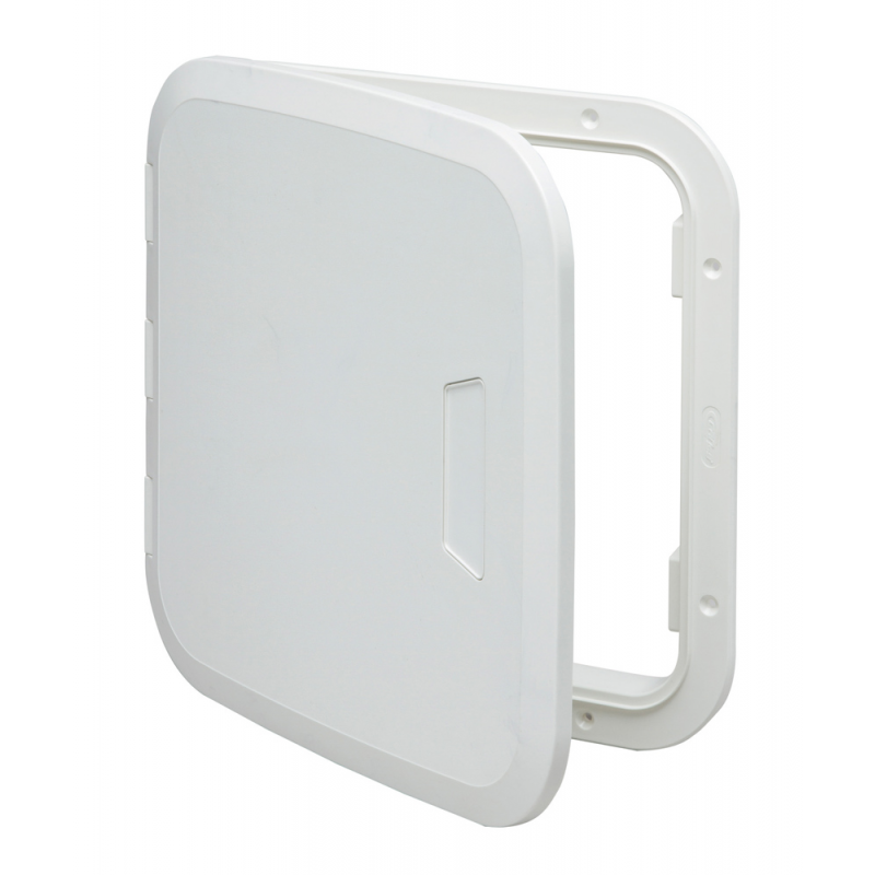 Sportello in ASA, resistente ai raggi UV, apribile a 180° con maniglia push-pull e chiusura a scatto. Montaggio verticale