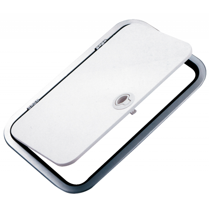 Sportello in profilato di lega leggera e metacrilato, dotato di cerniere in acciaio inox e chiusura a scatto. Presenta angoli arrotondati con curvatura R50.