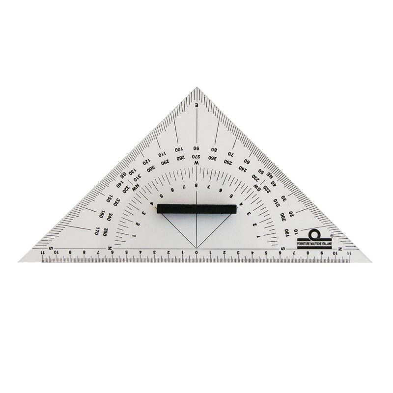 Squadra nautica in plexiglas trasparente con maniglia. Doppio goniometro incorporato e gradazione in millimetri.