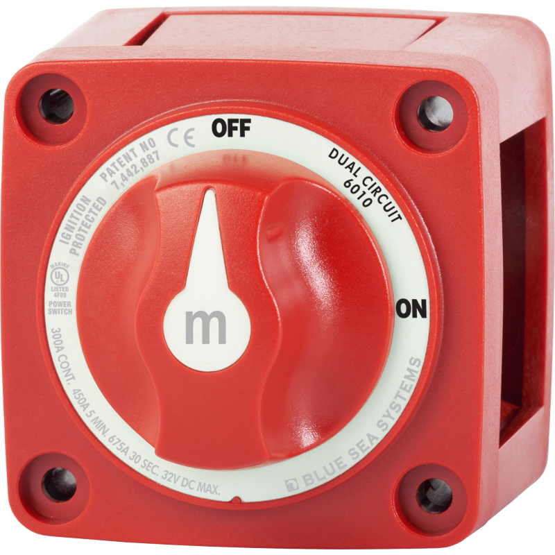 Staccabatteria bipolare realizzato in policarbonato rinforzato. Terminali di grandi dimensioni in rame argentato. Montaggio esterno o ad incasso. Commuta simultaneamente due banchi di batterie isolati.