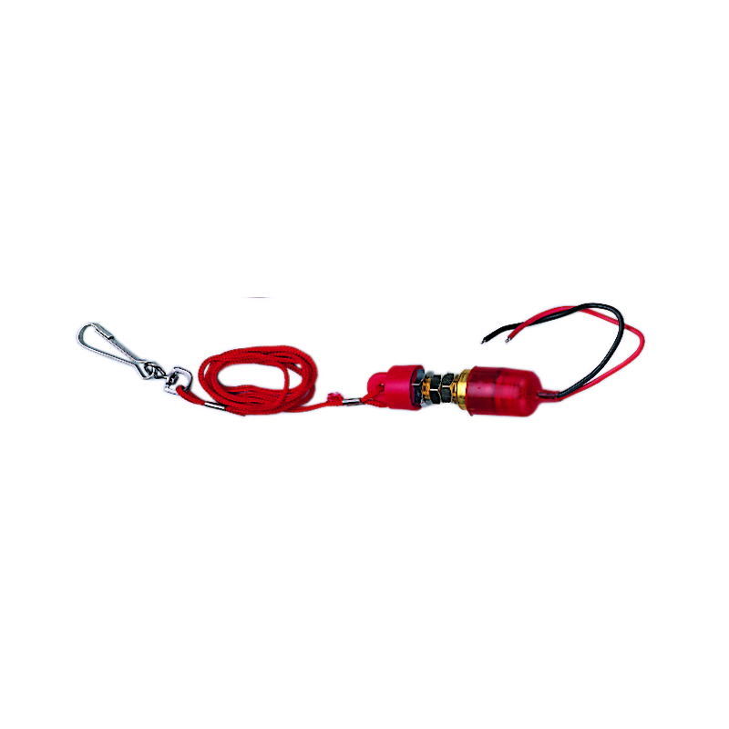 Stacco automatico di sicurezza a strappo in ottone cromato regolamentare per l’accensione. Interrompe il circuito in caso di caduta fuoribordo del pilota.