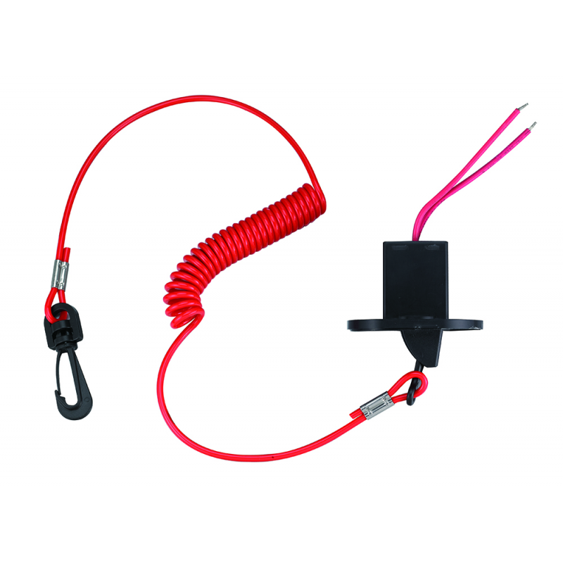 Stacco automatico di sicurezza a clips sfilabile. Stagno IP65, con cavetto a spirale. Interrompe il circuito in caso di caduta fuoribordo del pilota.