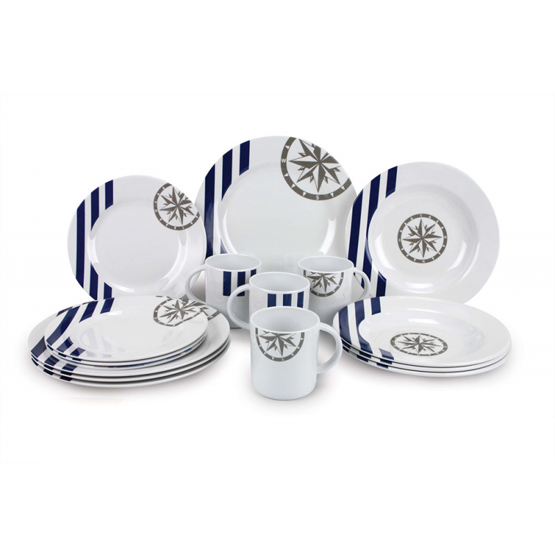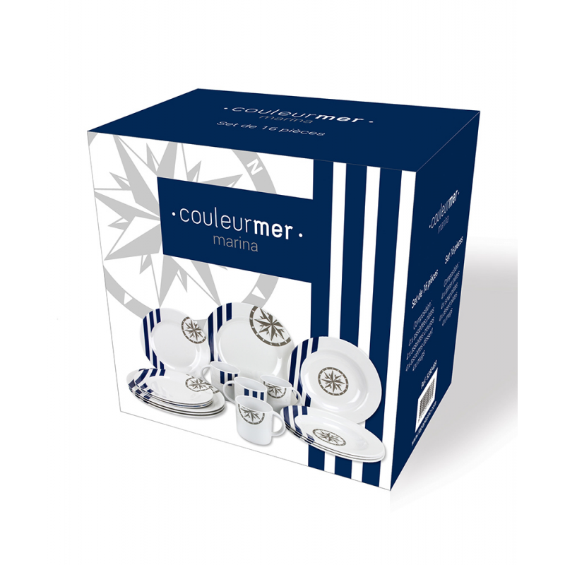 Marina Set per 4 persone stoviglie realizzate in melamina colorata. Scatola da 16 pezzi contenente: 4 piatti piani, 4 piatti fondi, 4 piatti da dessert e 4 mug.