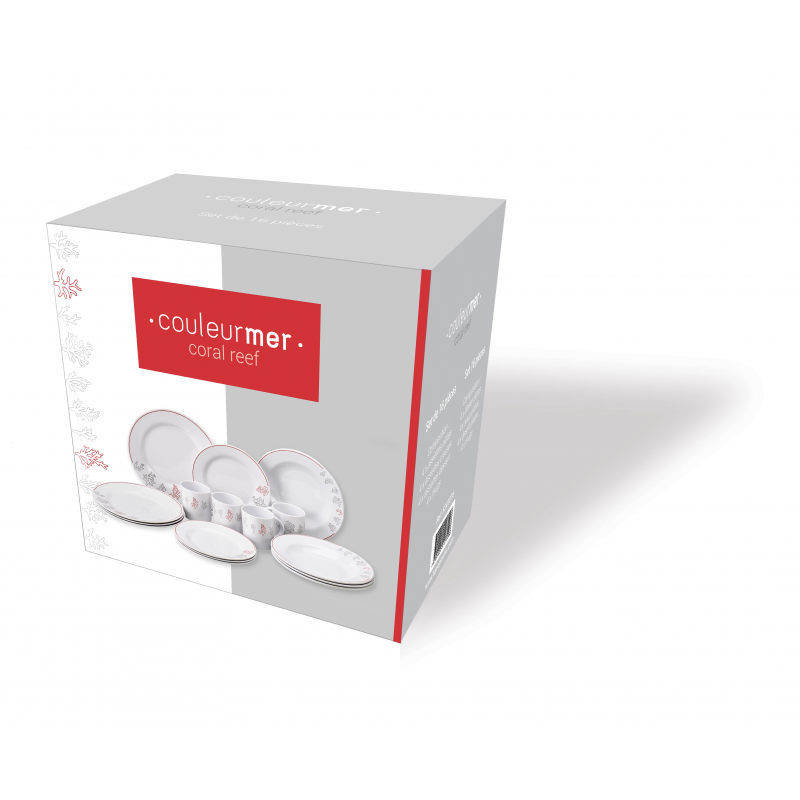 Stoviglie realizzate in melamina premium. Scatola da 16 pezzi contenente: 4 piatti piani, 4 piatti fondi, 4 piatti da dessert, 4 mug.