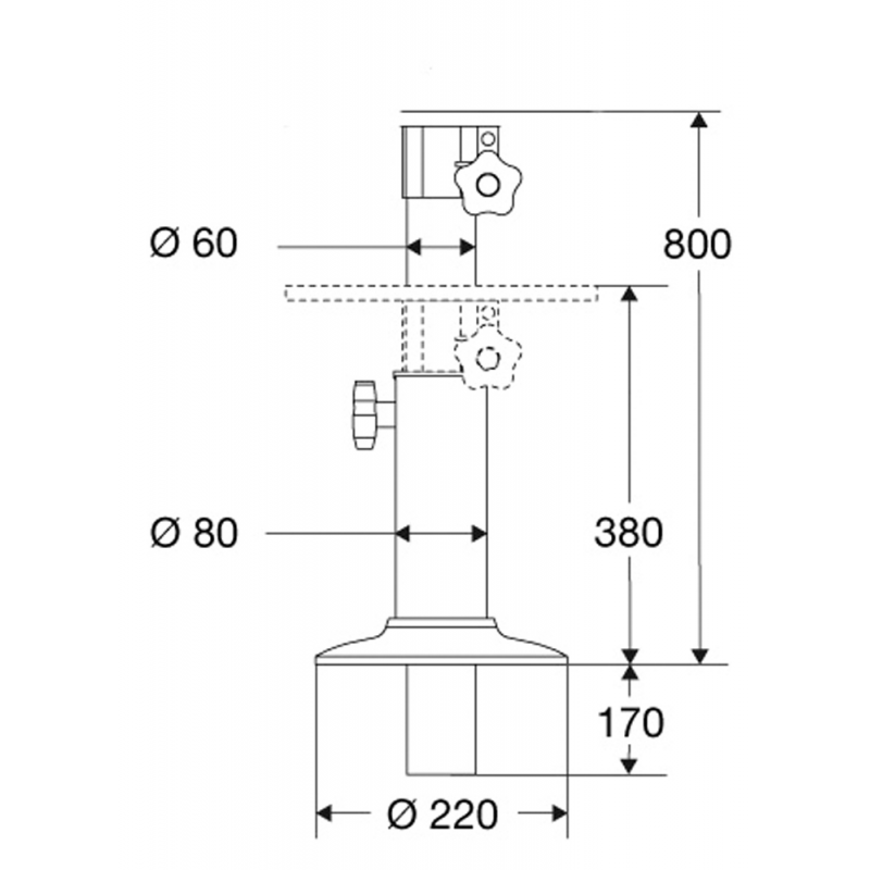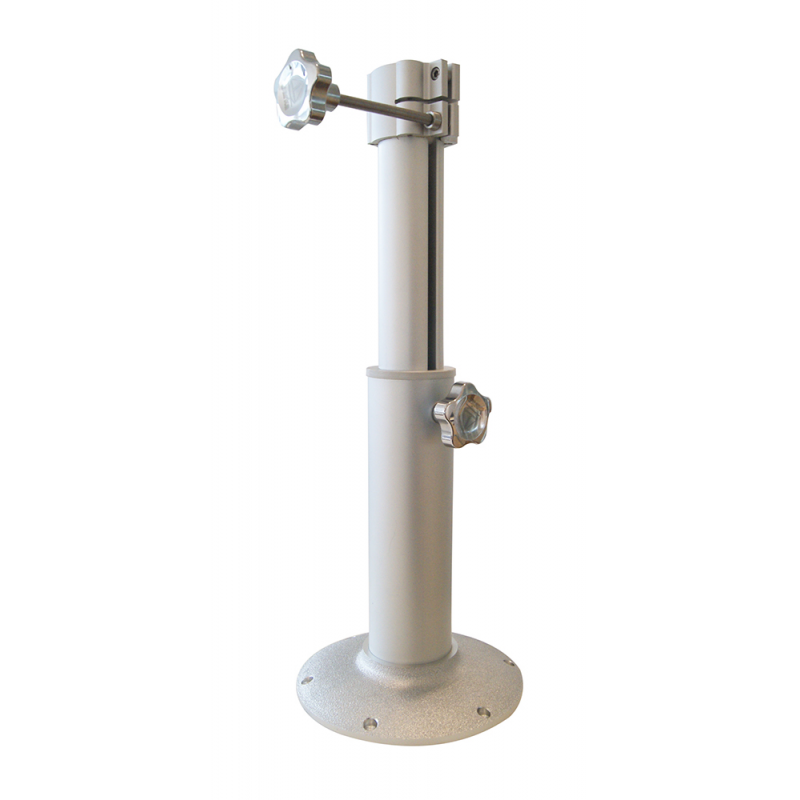 Supporto sedile o tavolo in lega leggera anodizzata, telescopico e girevole. Il tubo scorre fino a raggiungere la misura minima in altezza, a scomparsa nel gavone sottostante.