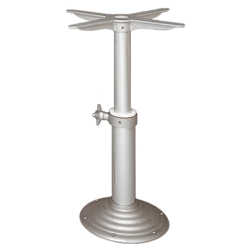 Supporto telescopico per tavolo con base superiore ad X. Presenta una base inferiore fissa e una colonna tubo, con un tubo interno. L’altezza è regolabile.