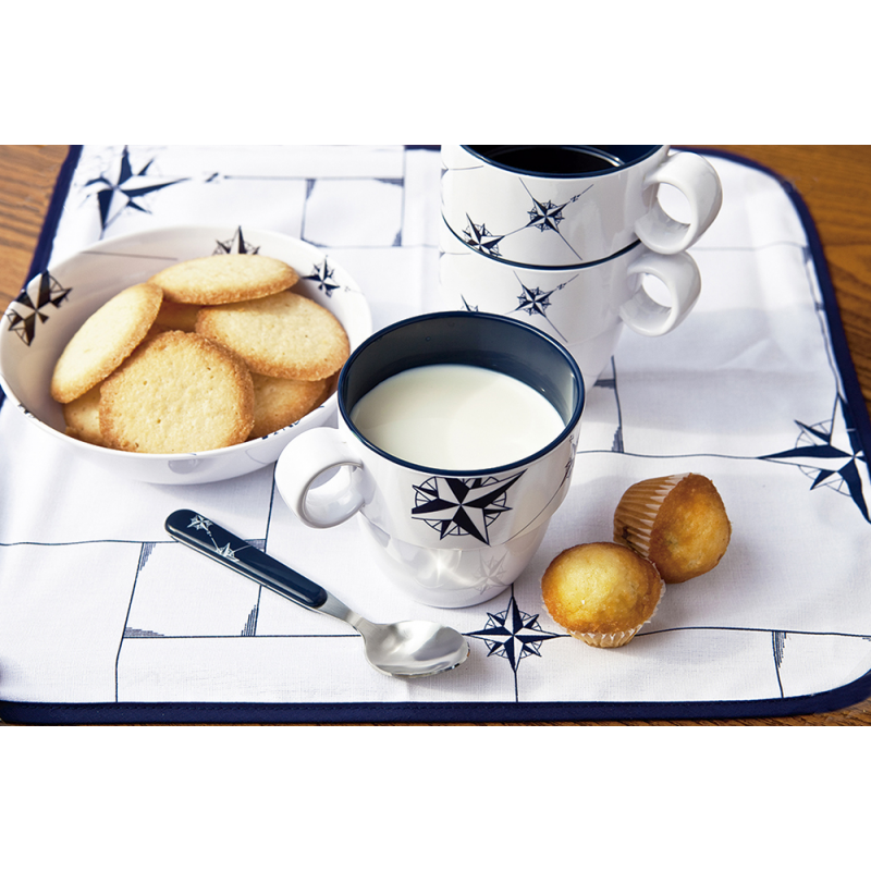 Servizio da tavola realizzato in melamina al 100%. Sui toni del blu navy e bianco. Lavabili in lavastoviglie. Le stoviglie, le tazze e i bicchieri hanno un anello antiscivolo alla base che ne impedisce lo scivolamento sul tavolo.