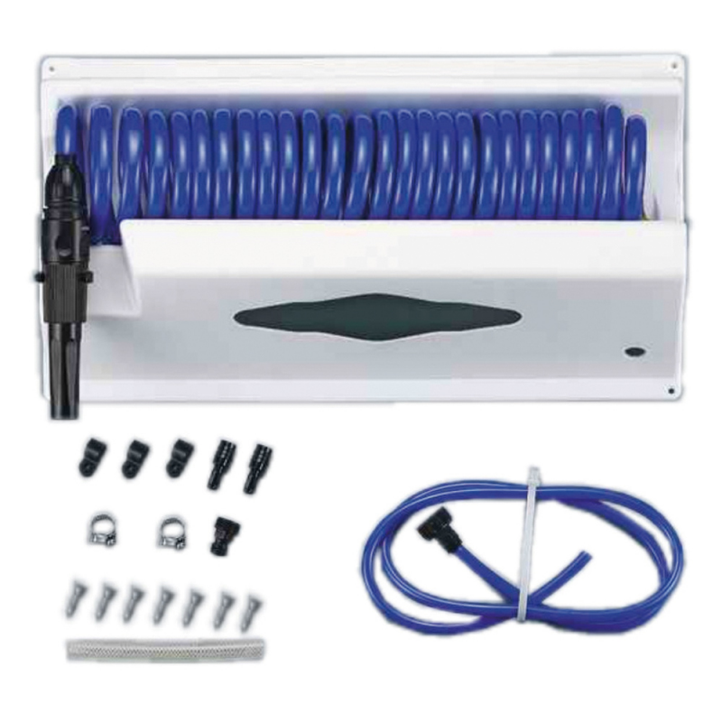 Supporto portatubo in plastica montaggio a parete completo di tubo acqua spiralato per collegamento alla rete idrica, lancia a getto regolabile e tubo di raccordo. Completo di serie di ugelli accessori.