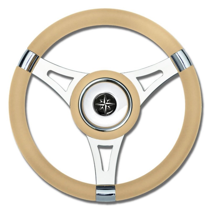 Volante a 3 razze in acciaio inox lucidato a specchio. Mozzo in acciaio, coperchio in vera pelle con logo rosa dei venti al centro.